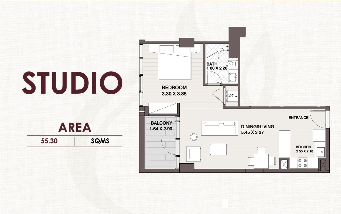 • Features: Living & dining area, open kitchen, balcony, dedicated bedroom space, bathroom, and entrance lobby